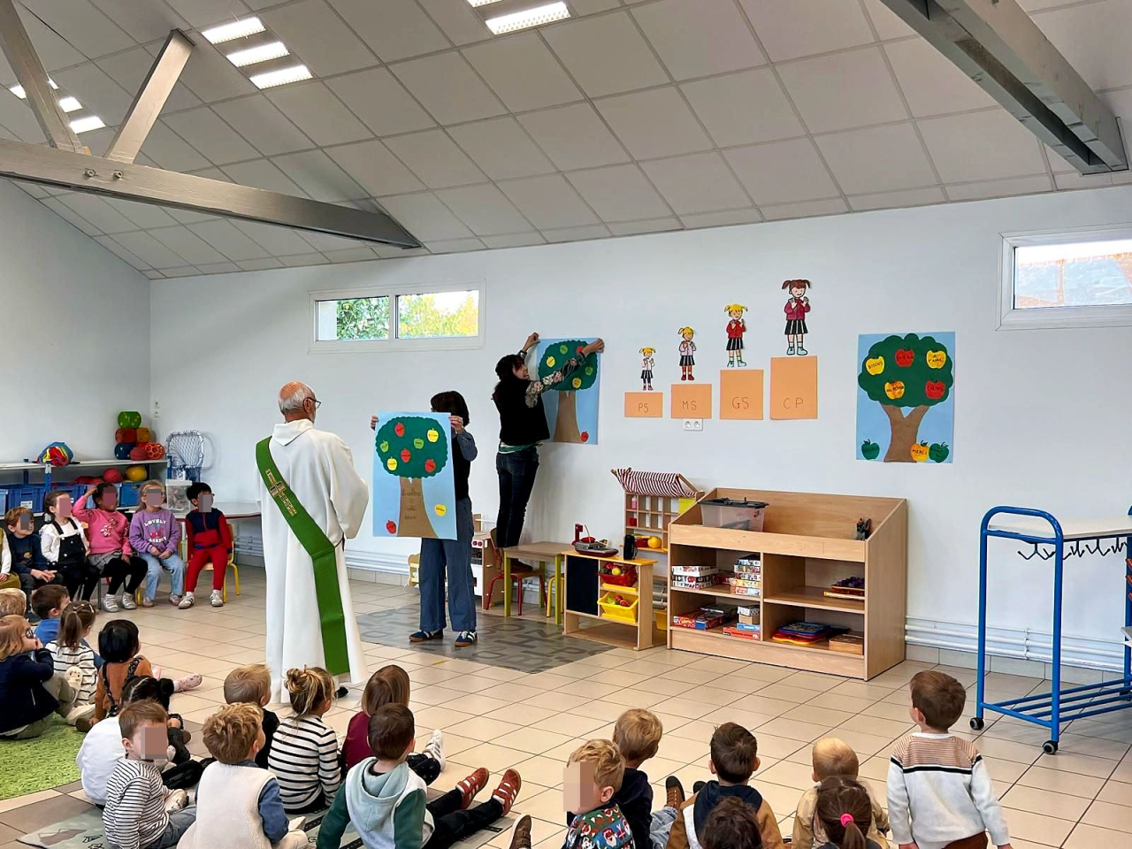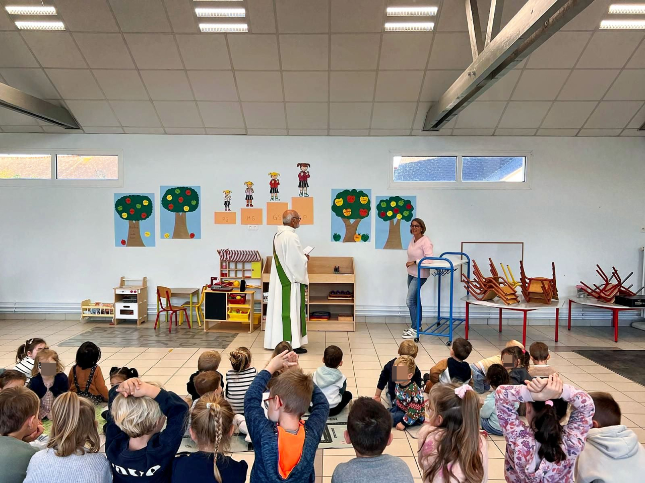 Vendredi 17 octobre, les 4 classes se sont retrouvées dans la salle de jeux pour assister à la célébration dirigée par M. Tortellier, diacre de la paroisse.